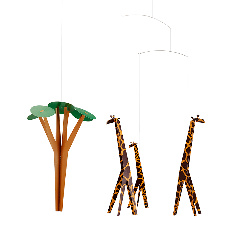 Graceful giraffes have large, sensitive hearts and are the “dreamers” of the savannah. Depicted here moving gently ‘round the tree.
